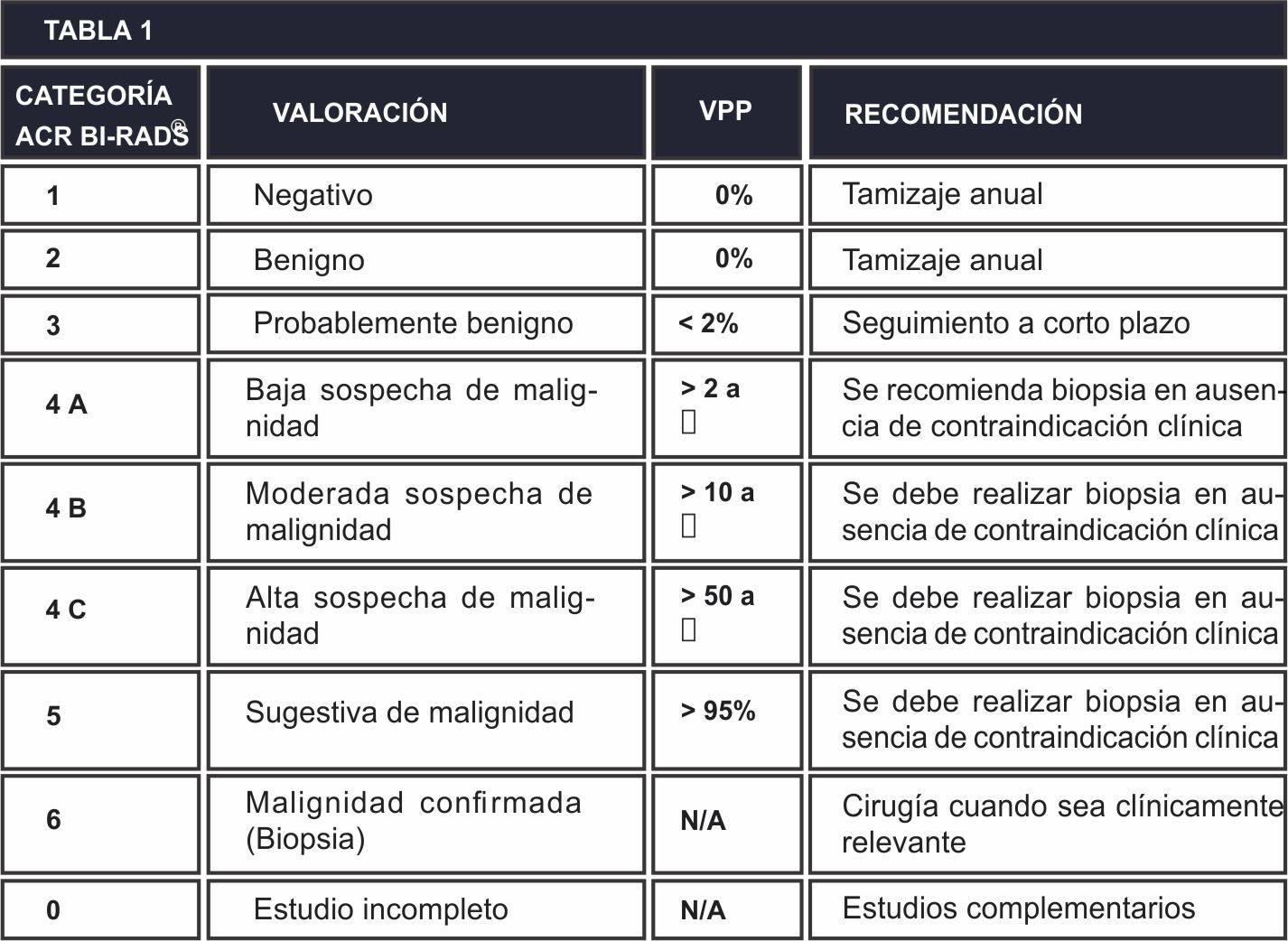 Dicho sistema inicialmente creado a ido evolucionando y actualmente incluye ultrasonido, resonancia magnética, además de la mamografía. De esta manera el sistema ACR BI-RADS® crea un lenguaje universal, único y definido que permite categorizar las lesiones de acuerdo al grado de sospecha, asignando un VPP y establece conductas a seguir (Tabla 1).