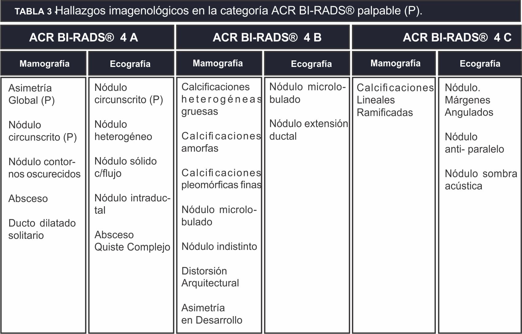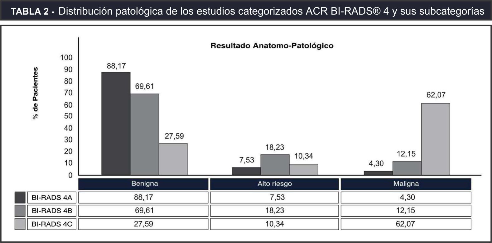 BI-RADS® 4 fue del 12% (n=48), para cada subcategoría