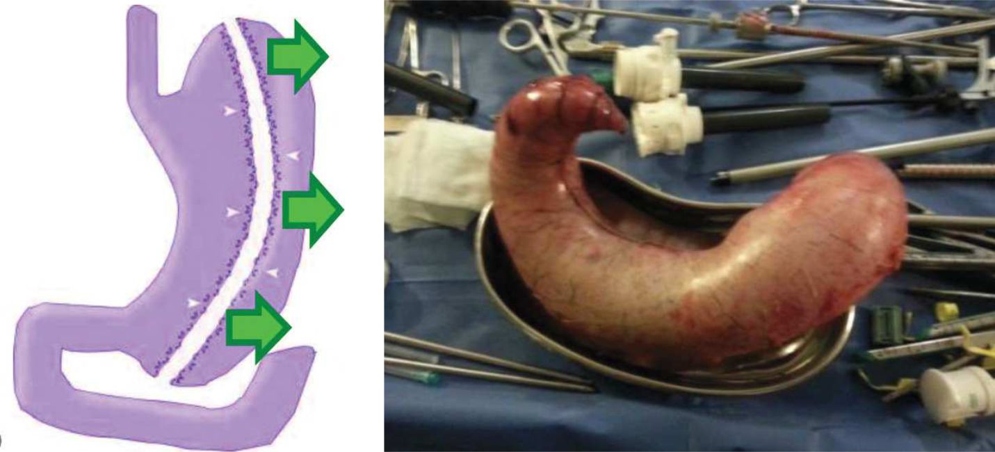 f- Otras Otras complicaciones descritas luego de la intervención son: el desarrollo de enfermedad por reflujo gastroesofágico, el aumento en el volumen del remanente gástrico con el consiguiente aumento de peso a mediano y largo plazo, el vólvulo del estómago post operado, el vólvulo de intestino post operado así como la herniación intra-torácica del estómago residual (6)