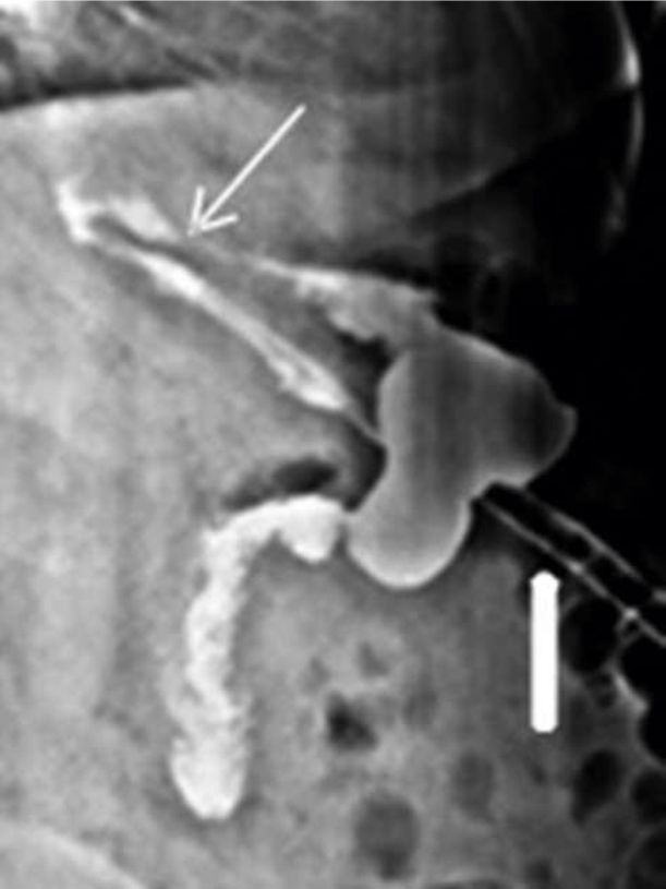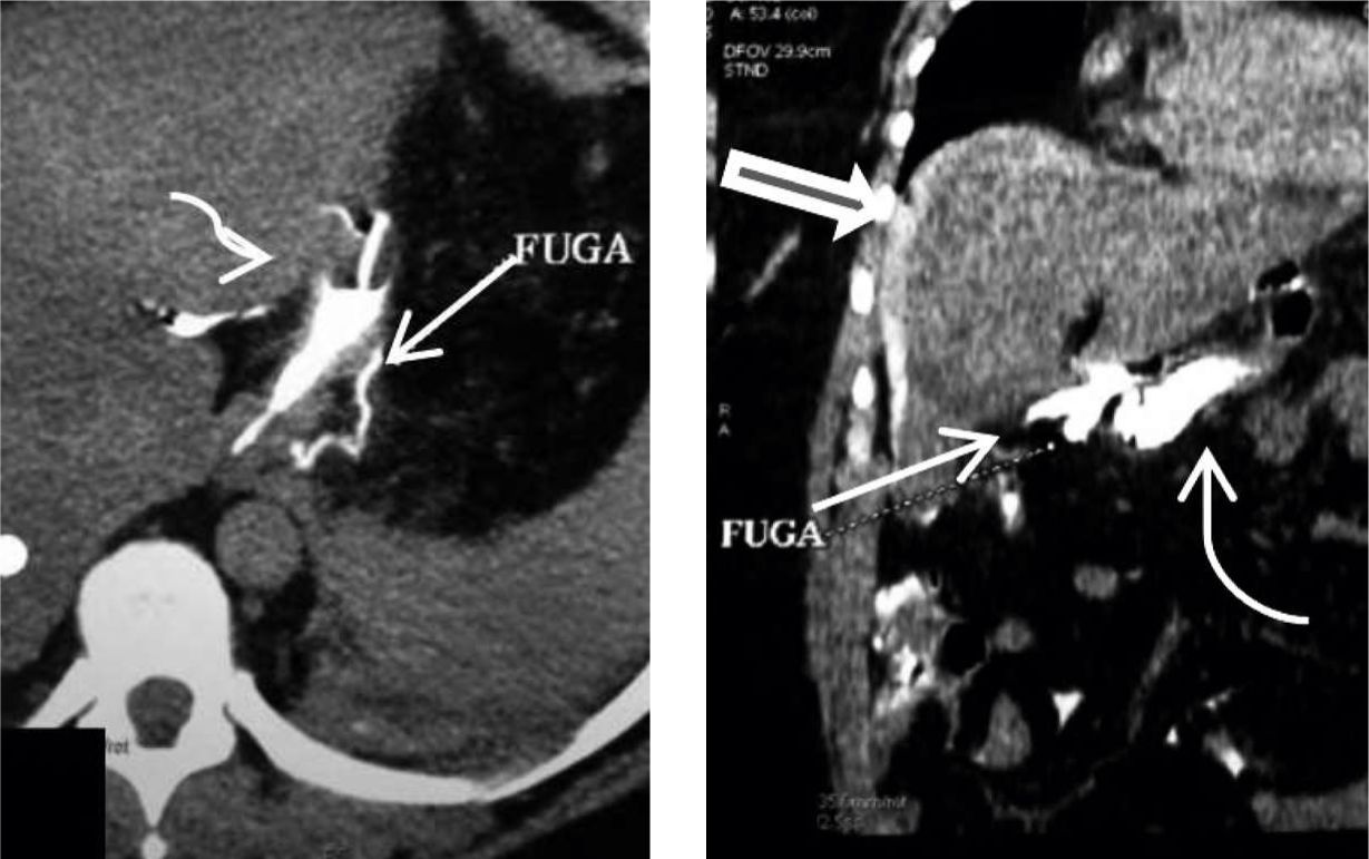 del medio de contraste en sentido izquierdo (flechas). (Paciente Nº 14)