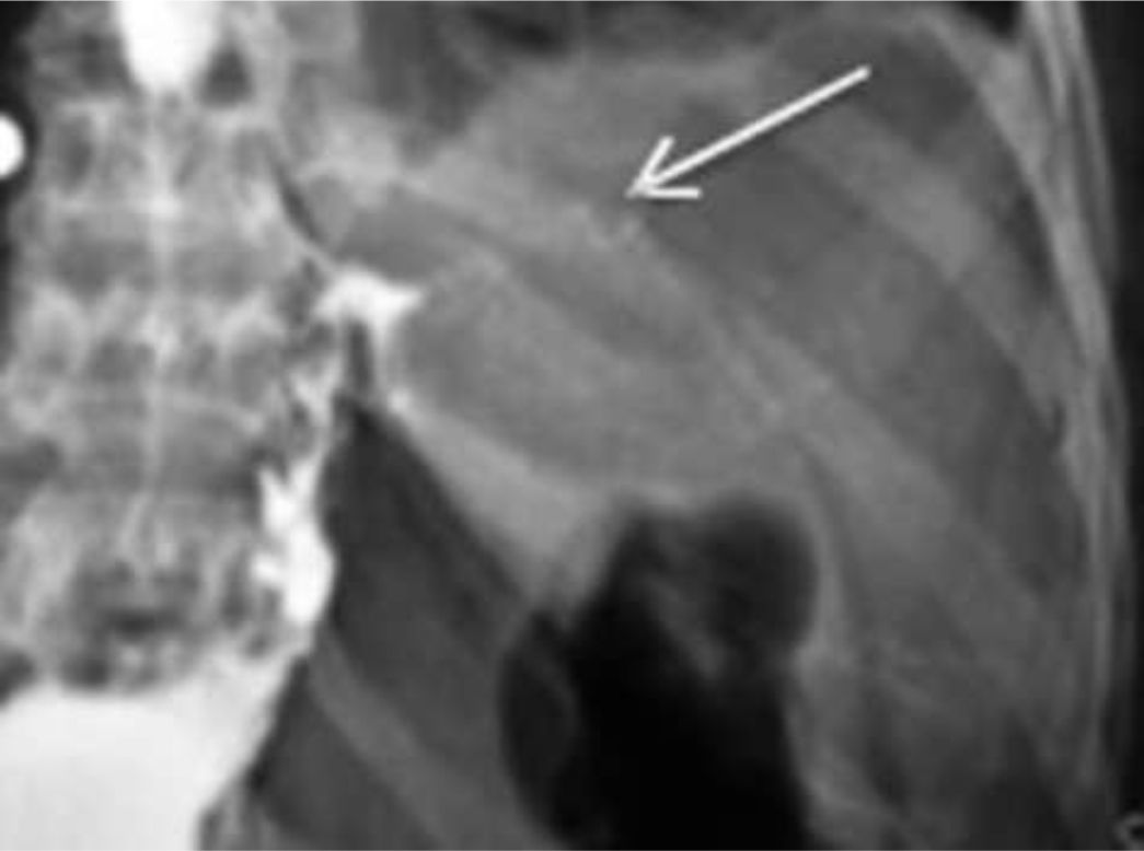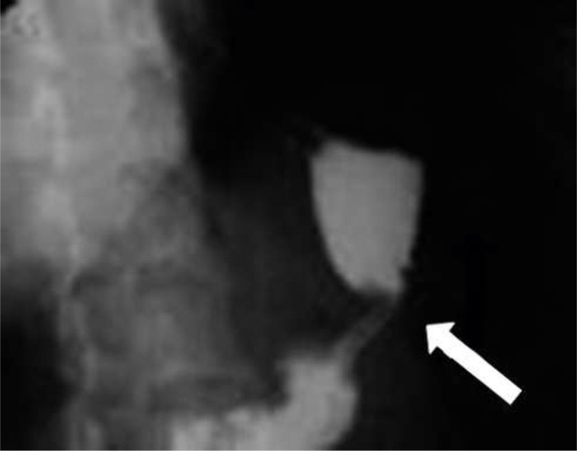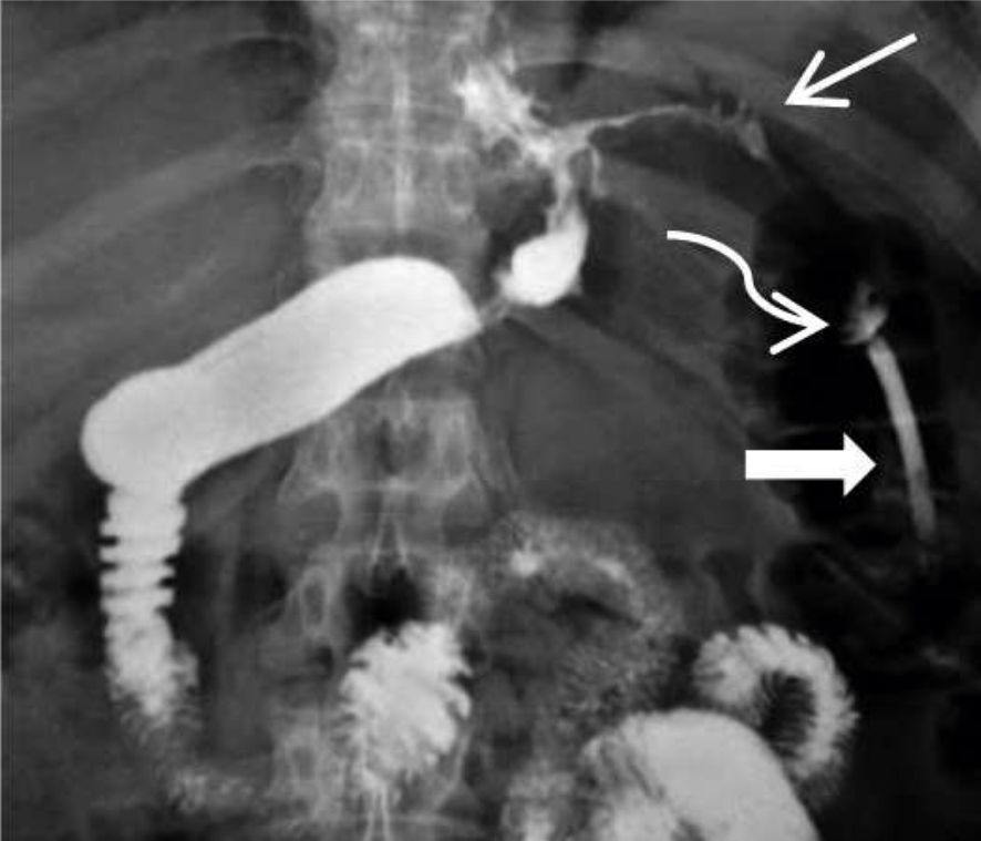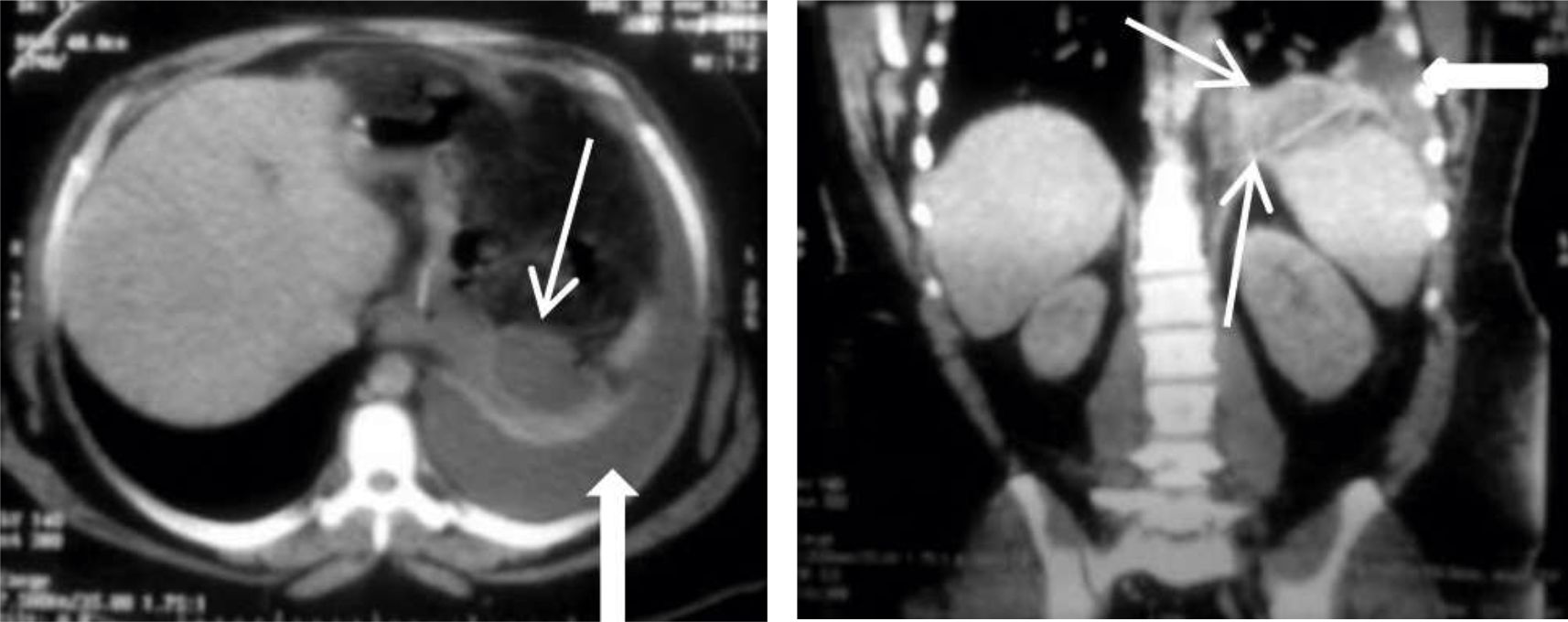 contraste oral observándose un absceso a nivel subfrénico izquierdo (flecha fina) y escaso