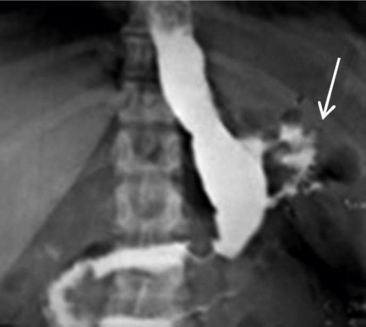 Cuando la fuga es del sector superior de la GM, los estudios de EGD pueden no identificarla por el rápido pasaje del contraste durante la deglución (9) Ante la sospecha de fuga, el primer estudio a solicitar es una TC de abdomen y pelvis con contraste oral e intravenoso, dado que permite valorar la existencia de fugas y/o colecciones perigástricas, así como líquido intraabdominal y neumoperitoneo. (3,6)