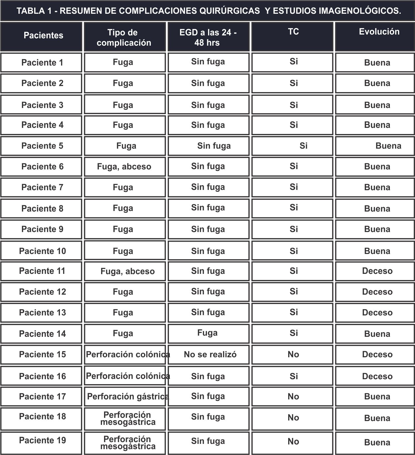 Dos pacientes presentaron abscesos diagnosticados mediante TC y dos pacientes presentaron estenosis meso-gástricas diagnosticadas por EGD. Una de ellas se presentó en forma precoz (Paciente 18) y la otra a los 2 meses de la cirugía (Paciente 19). Se vieron cuadros compatibles con peritonitis en el postoperatorio inmediato en 3 pacientes (Nº 15, 16 y 17). En todos los casos el diagnóstico fue clínico y no se realizaron estudios imagenológicos para confirmarlo.