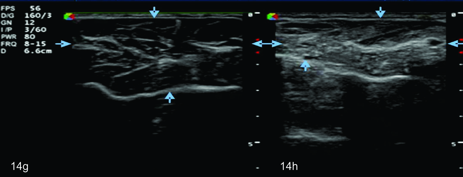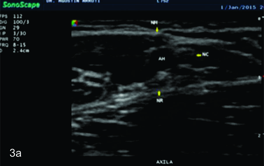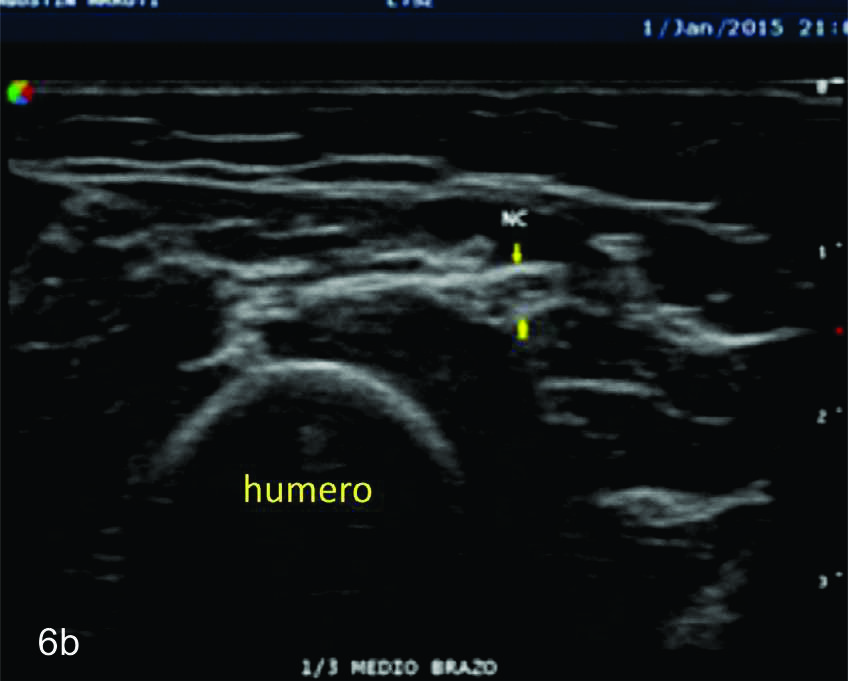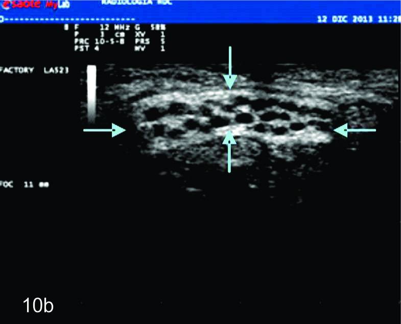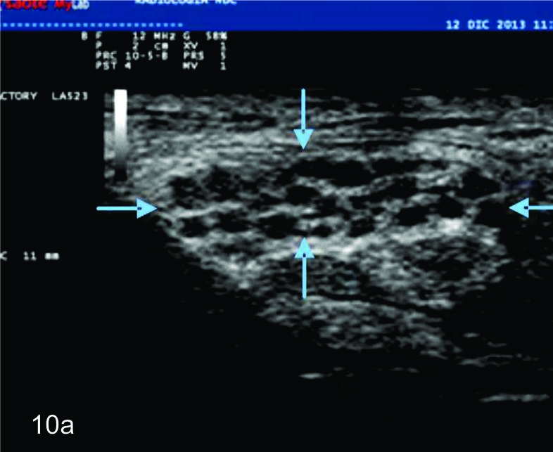 La apariencia ultrasonográfica de los nervios normales es relativamente uniforme, reflejando de buena forma su composición histológica. En planos en el eje corto, los nervios se ven por ultrasonido como estructuras en “panal de abeja” a manera de puntos hipoecogénicos incluidos en un fondo hiperecoico lo cual corresponde a los fascículos que corren longitudinalmente dentro del nervio y el fondo hiperecogénico se correlaciona con el epineuro interfascicular (Fig. 1).