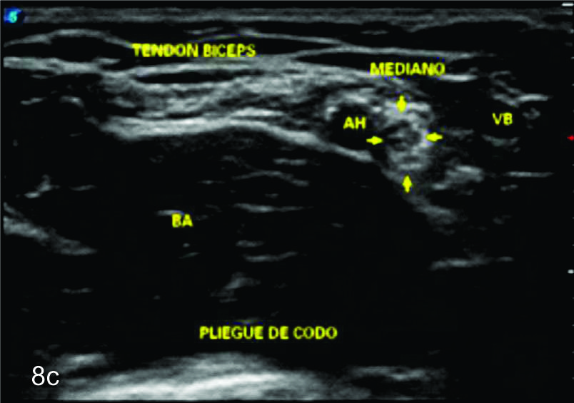 cubital (flechas blancas abiertas). B- Corte transversal del mismo paciente en donde se identifica