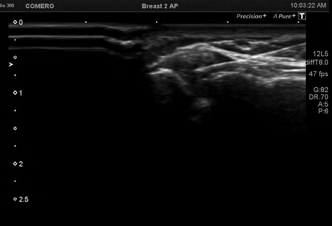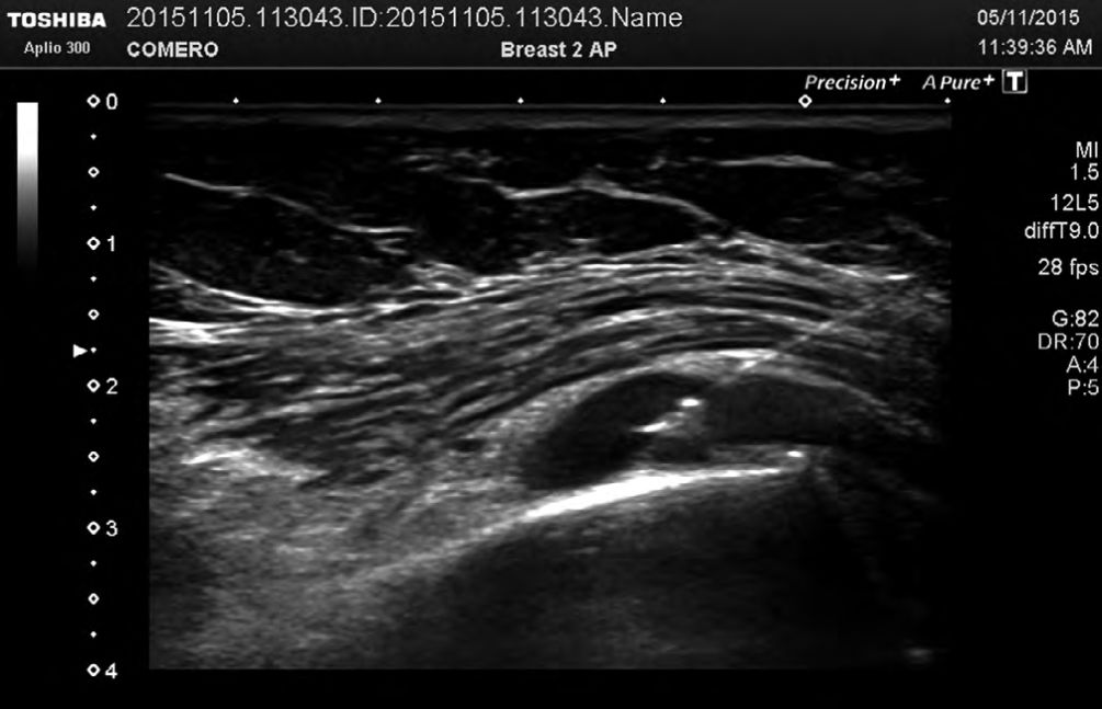 Los procedimientos se realizaron bajo condiciones de asepsia habituales, con desinfección de piel con clorhexidina alcohólica al 0.5 %. No se empleó gel estéril, ni funda de protección de los transductores, ya que el sitio de punción se ubicó a dos centímetros del mismo, evitando así que la aguja estéril contactara con el transductor. (4) La solución desinfectante actuó a manera de gel trasmisor de ultrasonido. Todos los procedimientos se realizaron con guía ecográfica en tiempo real mediante la modalidad “mano libre”, y “en plano” con visualización de la punta de la aguja en todo momento. Para la realización de la infiltración de bursa SASD, los pacientes se ubicaron en decúbito supino, con la mano del brazo a infiltrar debajo de cadera homolateral. Se ubicó el sector bursal más próximo a la piel, de manera de minimizar el dolor con el menor trayecto posible de la aguja. (5-11)