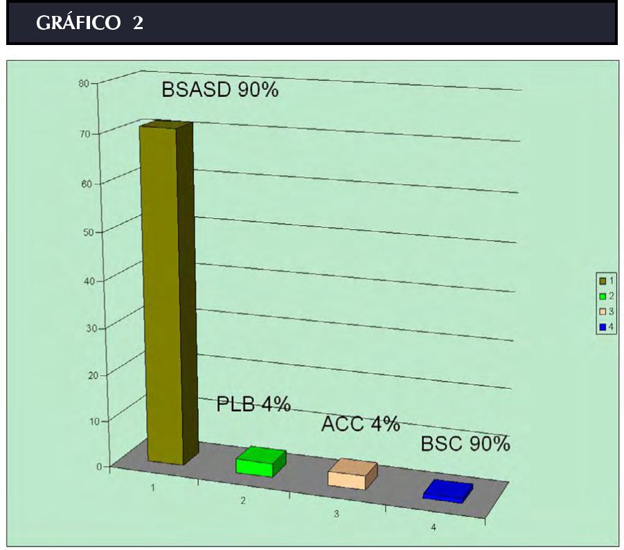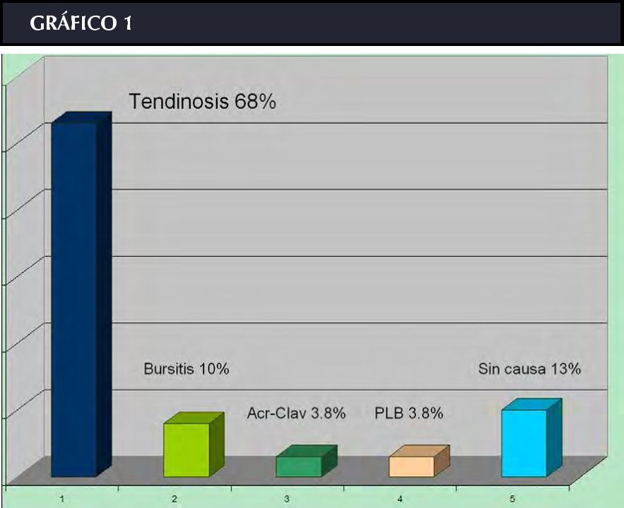 Las patologías detectadas fueron: 53 pacientes con tendinosis del supraespinoso asociada o no a ruptura del mismo, 8 pacientes con bursitis subacromiosubdeltoidea (SASD), 3 pacientes artrosis dolorosa de articulación acromioclavicular (ACC), 3 pacientes con tenosinovitis de la porción larga del bíceps (PLB), y 1 paciente con bursitis subcoracoidea. En 10 pacientes no se comprobó patología evidente. (Gráfico 1 patologías)
