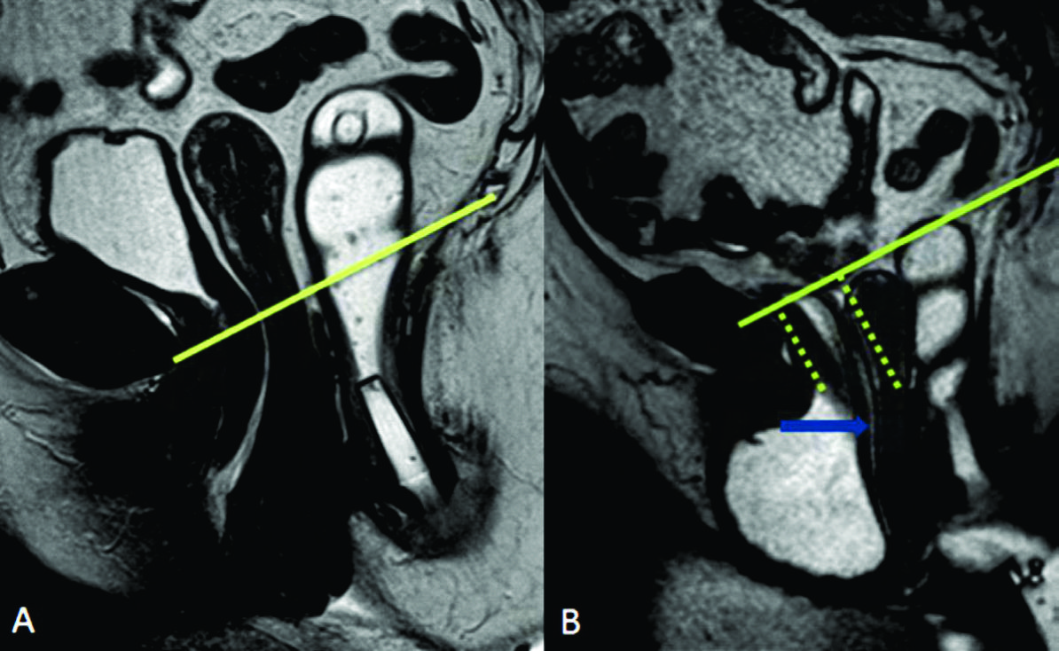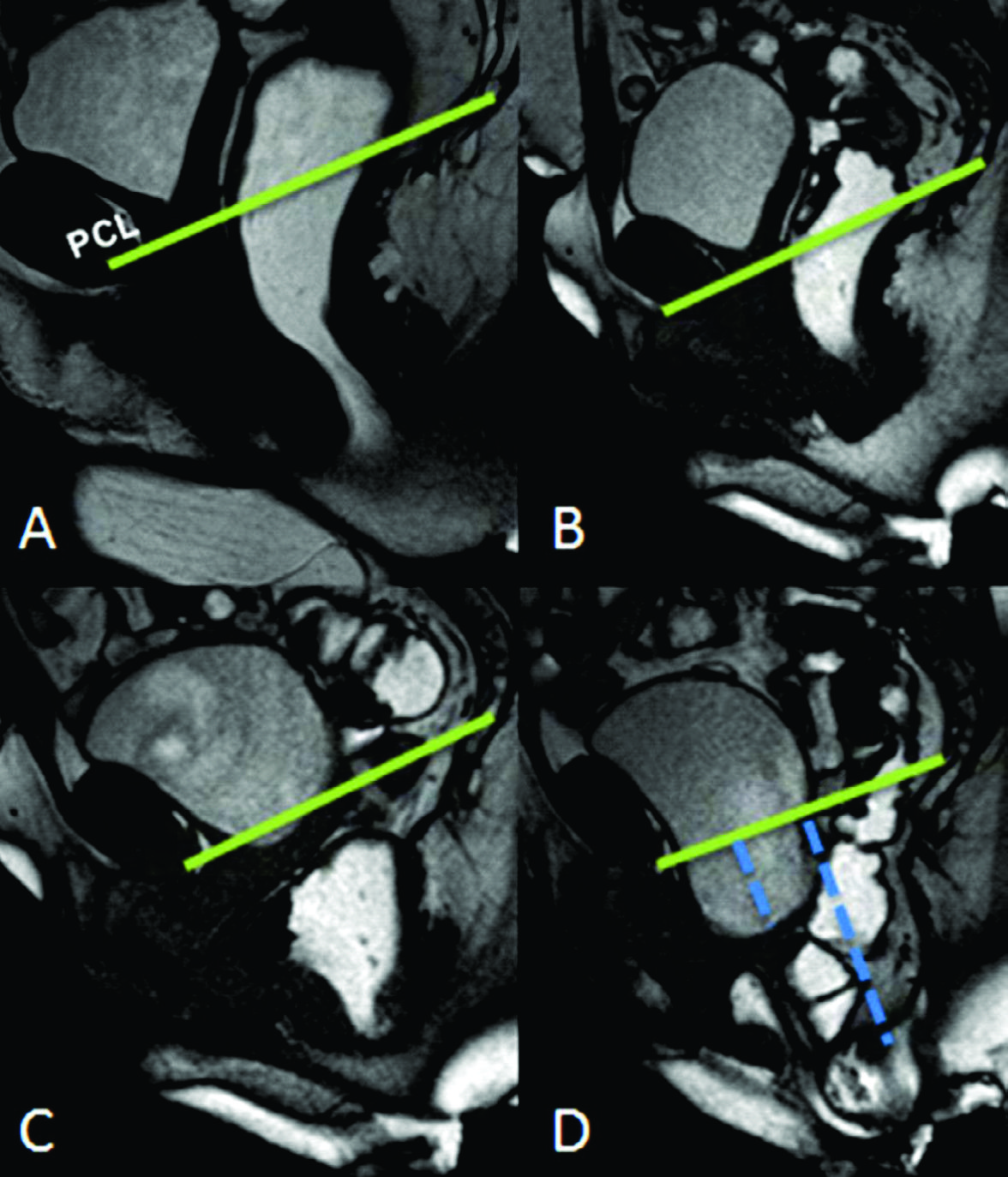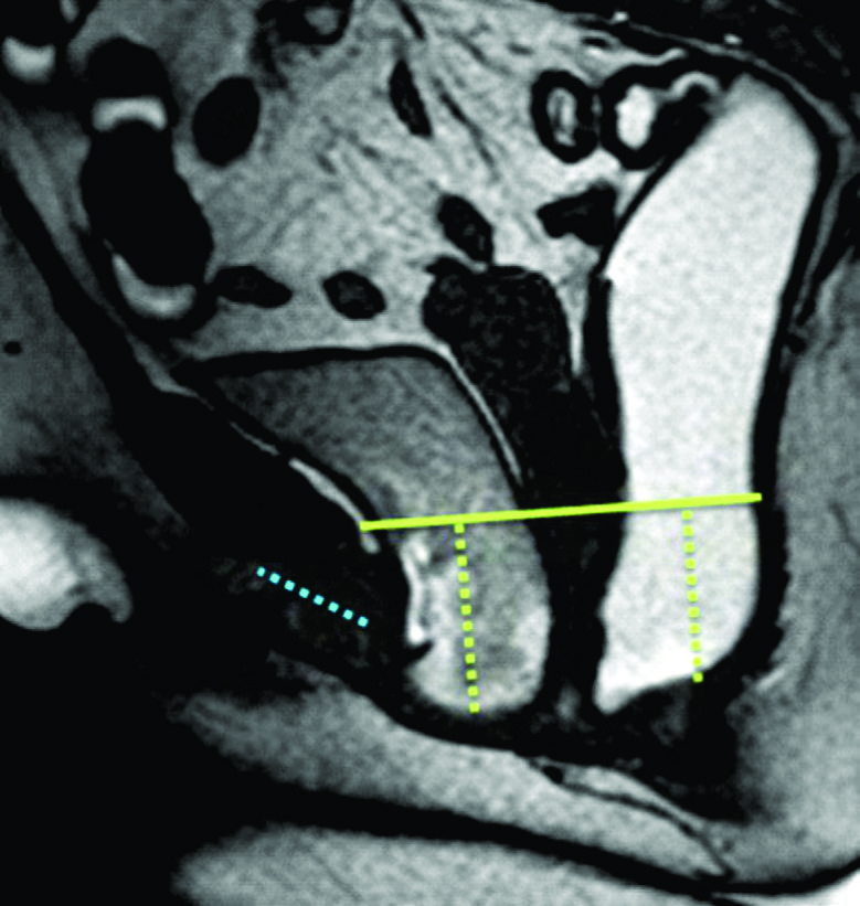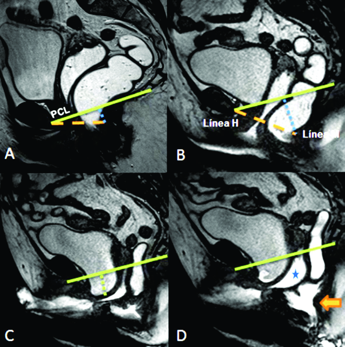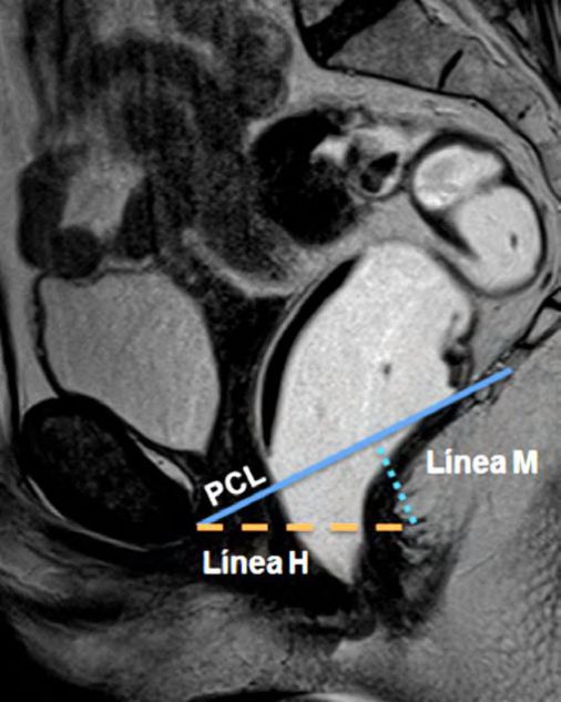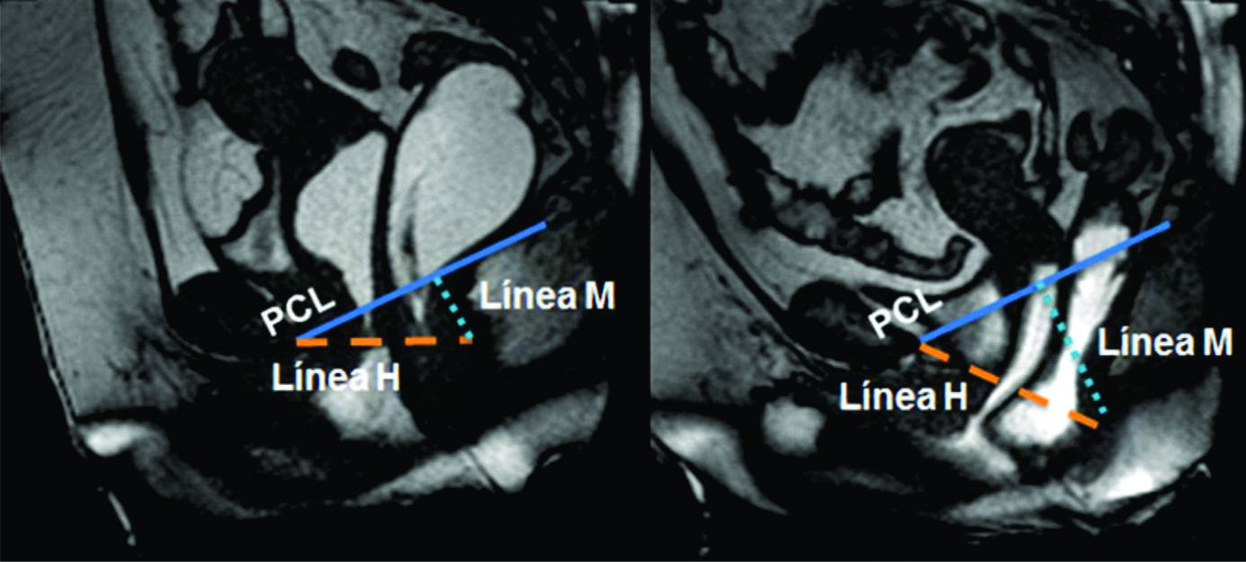 Se trazaron la línea PCL (línea continua azul), línea H (línea punteada naranja) y línea M (línea punteada celeste). El músculo puborectal se topografía inmediatamente por detrás de la unión ano-rectal y el plano