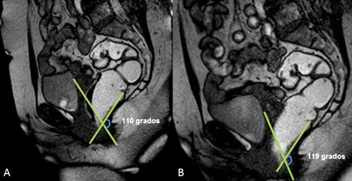 Ángulos de referencia. Medición del ángulo ano-rectal en una paciente sin patología del piso pélvico. Imagen de la línea media potenciada en T2 en el plano sagital.