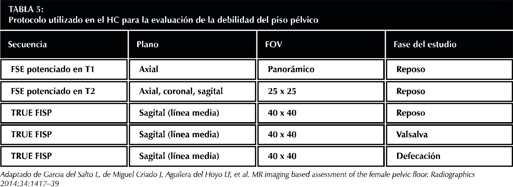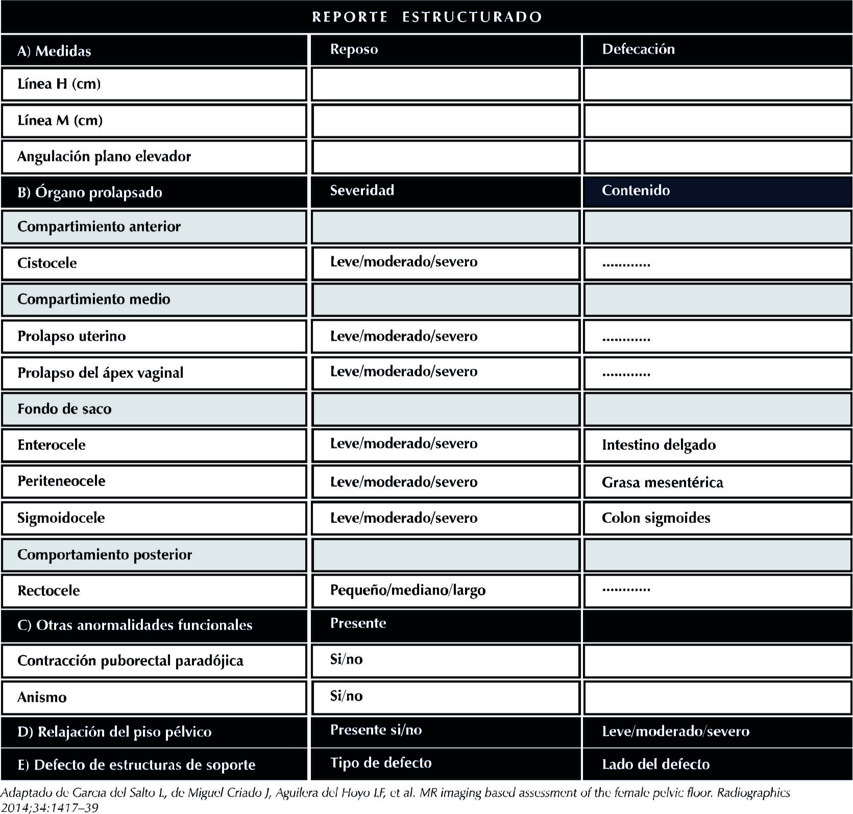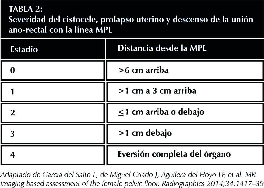 Discussion: The involvement of the pelvic floor represents a high frequency pathology, increasing its prevalence with age. Its high percentage of relapses and of multicompartimental affectation makes clinical assessment and surgical resolution difficult. MRI offers a diagnostic method that is easy to perform, capable of simultaneously evaluating the three compartments of the pelvis, especially important when there is multicompartimental involvement. The HMO system is a tool that allows interpreting, communicating and categorizing the pathological findings for a standardized radiological report.