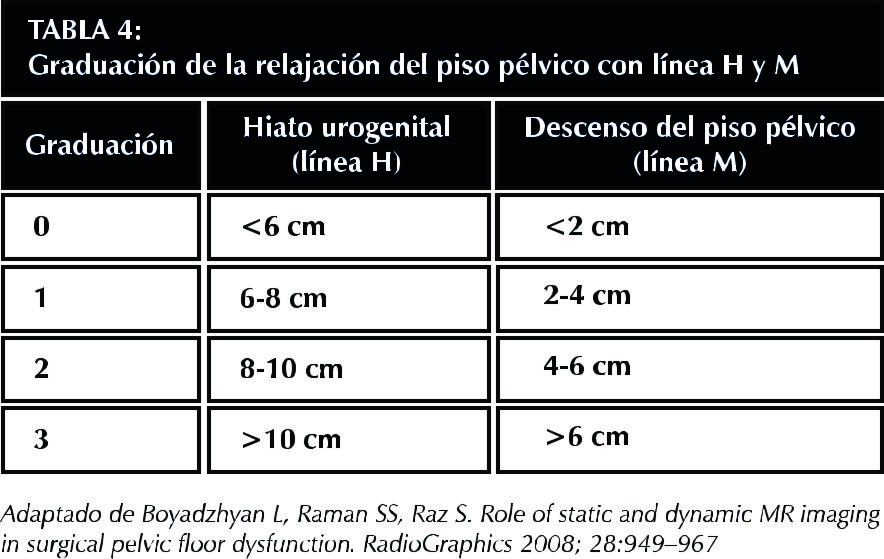 Materiales y métodos: Se revisaron en forma retrospectiva 16 estudios imagenológicos por RM de pacientes de sexo femenino, realizados en el servicio de imagenología del HC. El protocolo utilizado constó de secuencias morfológicas FSE T1 axial, T2 de alta resolución en los tres planos y secuencias dinámicas TRUE FISP en el plano sagital en la línea media, durante el reposo, contracción de la musculatura pélvica, maniobras de Valsalva y defecación.