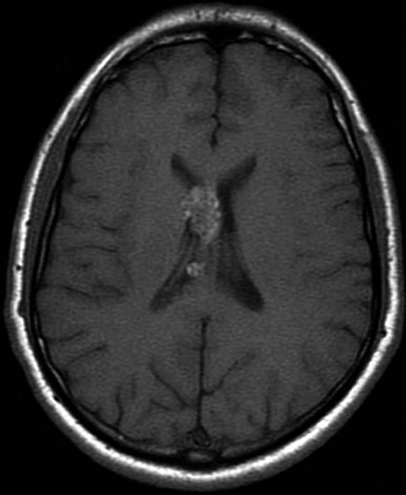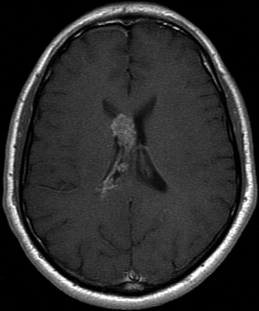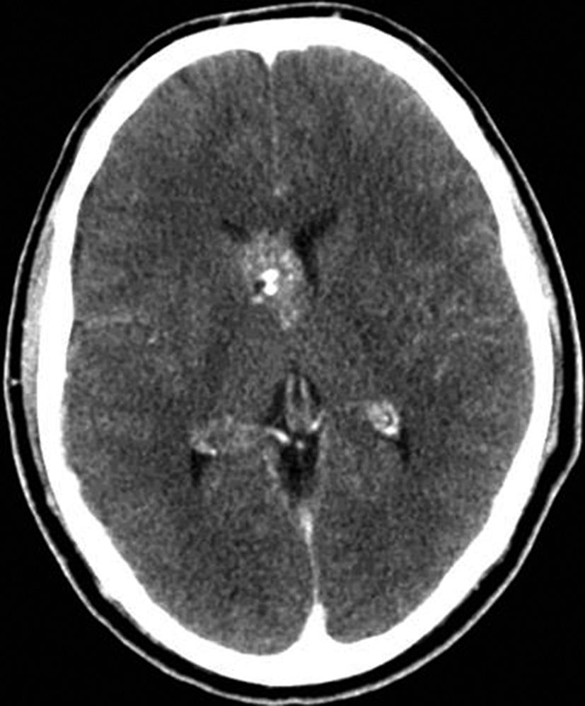 Se presenta el caso clínico de un paciente de sexo masculino, de 36 años de edad, sin antecedentes personales a destacar. Consulta por cefalea holocraneana de larga data, sin déficit neurológico y examen físico normal. Dada la clínica del paciente se realiza una tomografía computada de cráneo sin contraste intravenoso que identifica una lesión bien definida espontáneamente hiperdensa, heterogénea con calcificaciones puntiformes localizada en el asta frontal del ventrículo lateral derecho. No hay edema peri-lesional, efecto de masa ni hidrocefalia (Figura 1- A). Debido a los hallazgos se decide administrar contraste intravenoso, no evidenciándose realce significativo de la lesión (Figura 1- B).