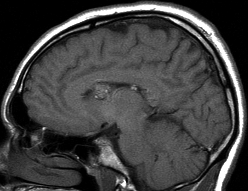a y b) Imágenes sagitales T1, A. se observa la lesión a nivel del asta frontal de ventrículo lateral derecho y B. se
