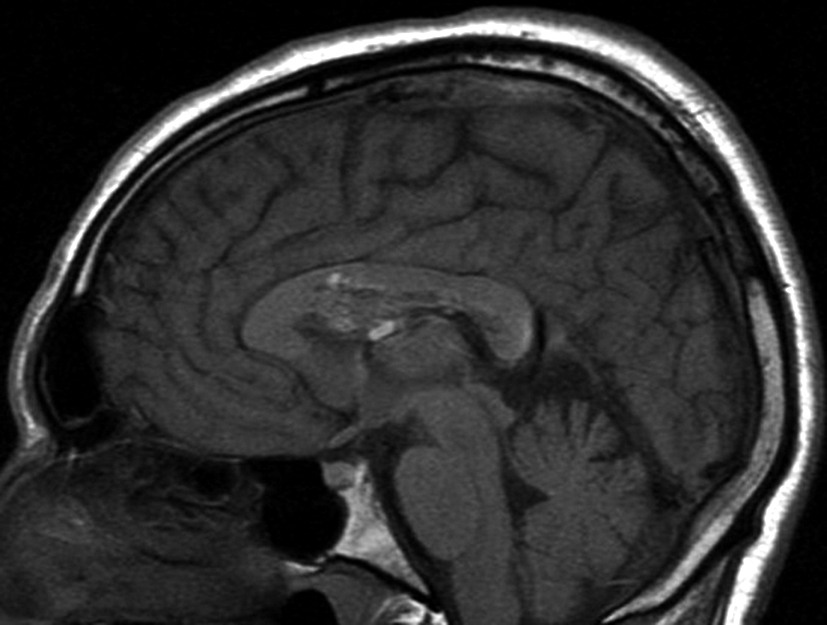 Con los hallazgos tomográficos, no se efectúan planteos diagnósticos y se realiza una resonancia magnética con la finalidad de obtener más datos semiológicos en busca de una aproximación diagnóstica. Se realizó el estudio por medio de secuencias T 1, FSE T 2, FLAIR, SWI y Difusión, en cortes axiales, FSE coronal y sagital T 1. Se realiza la administración de gadolinio DTPA en los tres planos. Se evidencia la lesión bien definida a nivel del ventrículo lateral derecho, que involucra al tronco del cuerpo calloso (Figura 2- C y 3- B). Presenta intensidad de señal heterogénea en secuencias T1 y T2 (Figura 3 y Figura 4). En secuencia ecogradiente se observa una señal marcadamente hipointensa y heterogénea, con un halo hipointenso bien definido (Figura 2- C). No presenta realce significativo tras la administración de Gadolinio (Figura 2- B) y en la secuencia de difusión no presenta restricción.