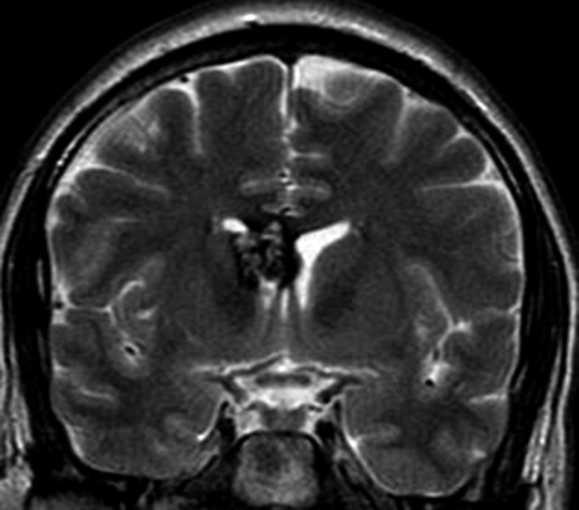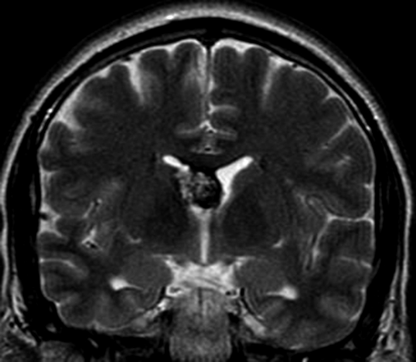 a y b) Imágenes coronales T2, Ay B. se evidencia la lesión con epicentro en el asta frontal del ventrículo lateral derecho y la extensión al cuero calloso.