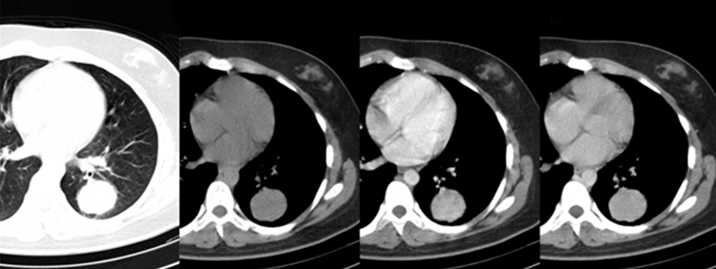 La presentación en la radiografía de tórax en la mayoría de los pacientes es como una masa o nódulo pulmonar solitario con bordes bien definidos, lisos o lobulados, de 1-10 cm de diámetro y de localización periférica, con predilección por los lóbulos inferiores (1, 4, 8, 10), similar a la presentación de nuestros pacientes.