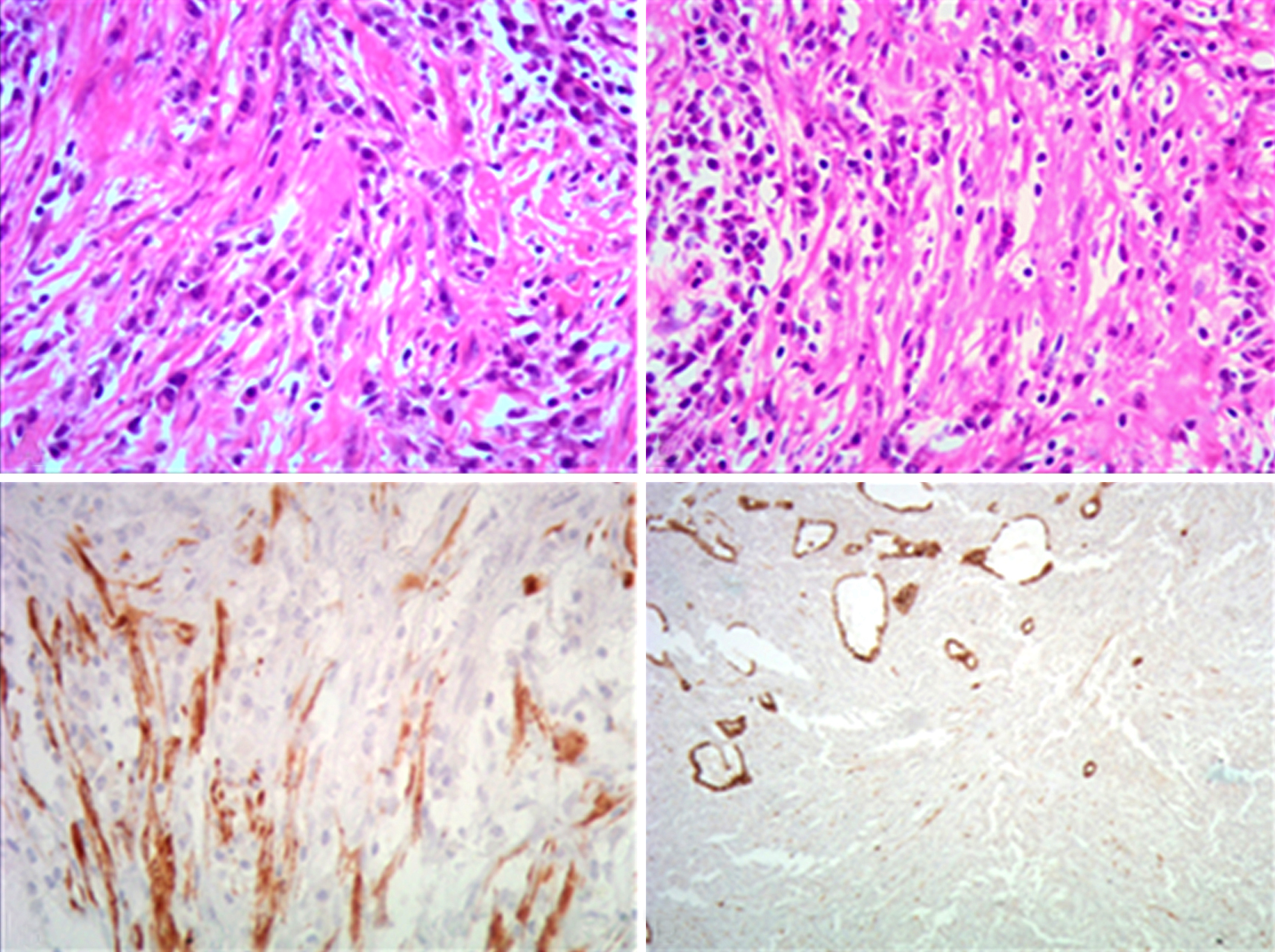 una mezcla de células fusiformes inflamatorias y miofibroblásticas,