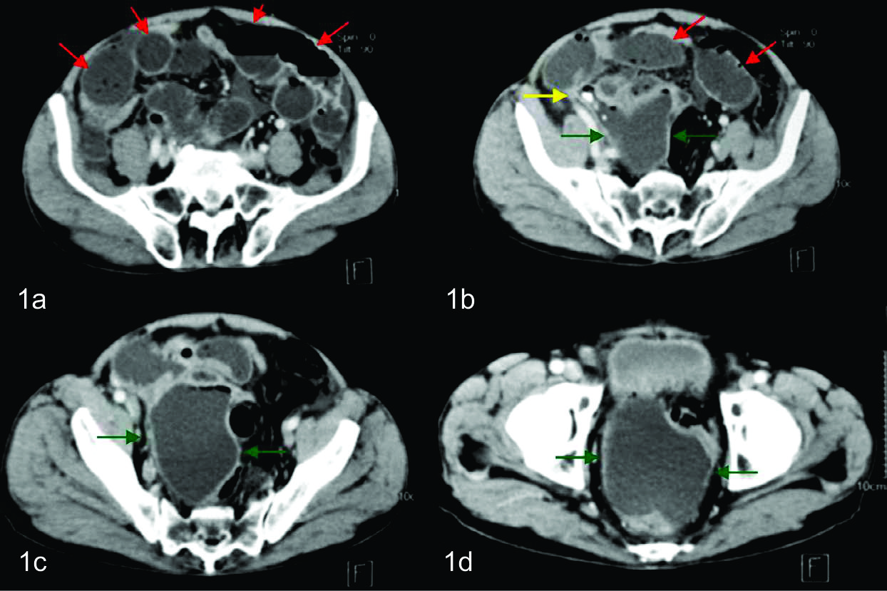 Se le realizo TC con Medio de contraste intravenoso (MC i/v) en fase portal , apreciándose asas intestinales distendidas, algunas de ellas con niveles hidro-aereos en su interior. Se observa además a nivel de la pelvis, con epicentro en el fondo de saco de Douglas una colección redondeada, bien definida, de paredes finas y regulares con contenido hipodenso.