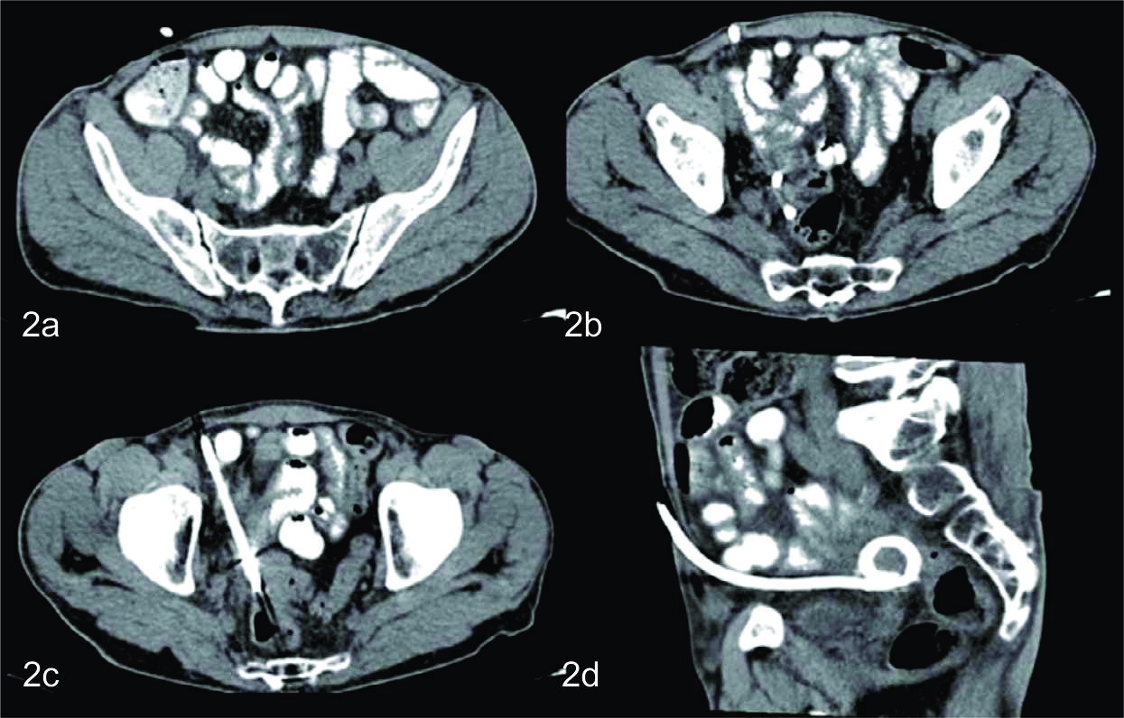 La misma, por su sector superior derecho se extendía hasta la fosa iliaca reconociéndose a dicho nivel tres pequeñas imágenes calcicas redondeadas, que fueron interpretadas como apendicolitos, elemento semiológico fundamental, para arribar al diagnóstico de apendicitis aguda complicada con absceso pelviano. Con dicho planteo diagnostico se discute junto con los cirujanos de guardia tratantes la posibilidad de realizar manejo percutáneo del absceso como tratamiento inicial, y determinan en la evolución la eventualidad de realizar cirugía definitiva. El procedimiento fue realizado bajo guía tomográfica con el paciente en decúbito supino, Se valoro ventana de acceso y se procedió a topografiar el sitio de abordaje en piel, que fue a nivel de hipogastrio. Se procedió a colocar el drenaje bajo técnica de Trocar, utilizándose un drenaje multipropósito 14 F. El mismo se dejó abierto a bolsa colectora con llave de tres vías. El material obtenido fue francamente purulento y se tomaron muestras del mismo para análisis bacteriológico, cultivando flora polimicrobiana.