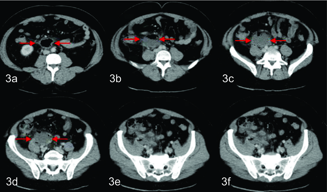 En la adquisición inicial se identifica una colección de paredes finas a nivel de fosa iliaca derecha, en relación a la raíz del mesenterio, inmediatamente por delante de los grandes vasos. La misma presentaba gas en el sector no declive y alteración de la densidad de la grasa adyacente, de aspecto inflamatorio.