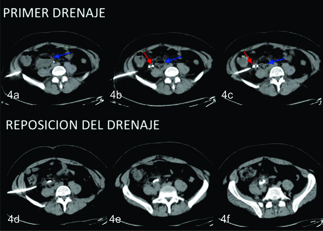 En el control tomográfico posterior, realizado a los 7 días del procedimiento, se reconoce el catéter de drenaje ingresando por la pared anterior del abdomen, el cual se dirige caudomedial con su extremo en el fondo de saco de Douglas, sin evidencia de colección residual. Se decide realizar prueba terapéutica cerrando el drenaje. Dada la buena evolución, el mismo es retirado a las 48 hs.